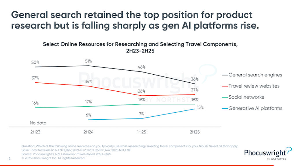 In keeping with Phocuswright’s newest analysis document, Seek Slips, AI Surges: Shuttle’s New Entrance Door?, that is an 11-point build up in only one yr. And whilst basic seek nonetheless leads all different analysis gear, its proportion is shedding as AI utilization grows, elevating the query of whether or not gen AI platforms may in the end overtake conventional seek because the most-used on-line shuttle making plans useful resource.